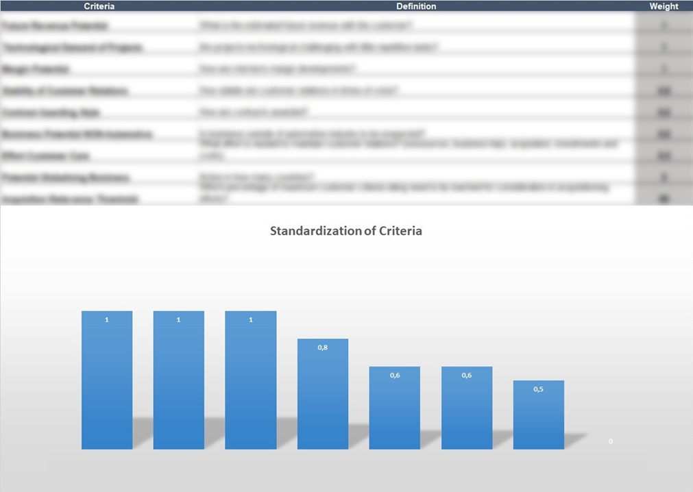 Weighted evaluation criteria and standardization methodology for strategic potential assessment.